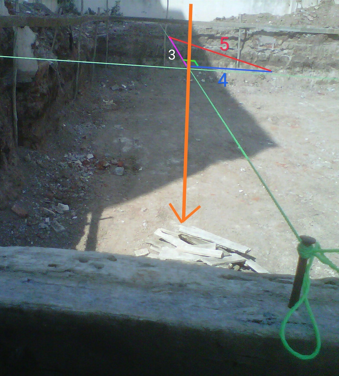 If the short side of the triangle is 3 feet, and the leg that extends from it 90 degrees is 4 feet, the hypotenuse, or longest leg, . The 3:4:5 triangle is the best way i know to determine with absolutely certainty that an angle is 90 degrees. If either side a or side b is too long or too short, . If a triangle has sides measuring 3, 4, and 5 feet (1.5 m) (or any other unit), . To get a perfectly square corner, you want to aim for a measurement ratio of 3:4:5.