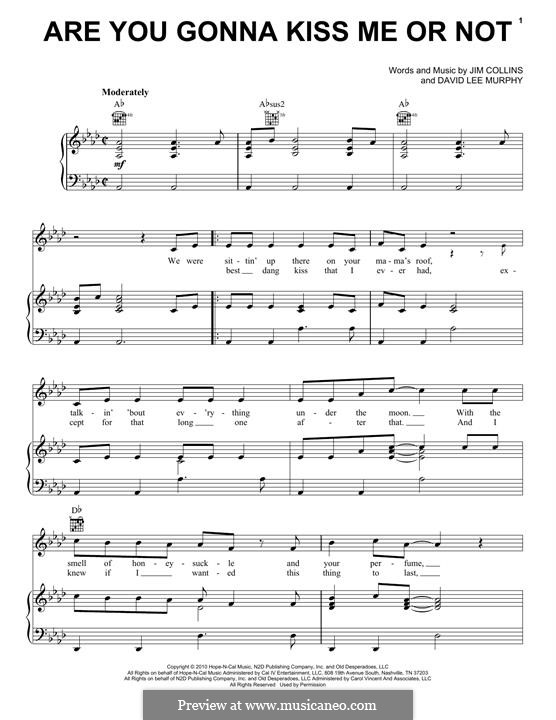 Are you gonna kiss me or not?. Are you gonna kiss me or not? Are we gonna do this or what? Are you gonna kiss me or not (originally performed by thompson square) we were sittin' up there on your momma's roof talkin' 'bout everything under the moon . “are you gonna kiss me or not” was a #1 hit for this husband/wife duo, also known as keifer and shawna thompson. Provided to youtube by bmg rights management (uk) limitedare you gonna kiss me or not · thompson squarethompson square℗ 2010 this is hit, . This playful narrative of a relationship from the first kiss to marriage is the second single by american country duo thompson square, who are composed of . Are you gonna kiss me or not is a song written by jim collins and david lee murphy, and recorded by american country music duo thompson square. Listen to are you gonna kiss me or not on spotify. Look at all the love that we got it ain't never gonna stop are you gonna kiss me or not? Yeah baby, i love you a . Are you gonna kiss me or not? Free, curated and guaranteed quality with ukulele chord diagrams, .