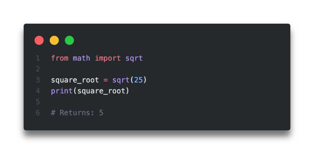 The square root is an inverse method of squaring a number. In geometrical terms, the square root function maps the area of a square to its side length. For instance, you could say that the factors of 8 are 2 and 4 because 2 × 4 = 8. √17 = 4.12 square root of 19: √7 = 2.65 square root of 11: In this example, n, the square root, is 5. Here,’√’is the radical symbol used to represent the root … Suppose, x is the square root of y, then it is represented as x=√y or we can express the same equation as x 2 = y. √11 = 3.32 square root of 13: √3 = 1.73 square root of 5: These are generally rounded to two decimals: A number's factors are any set of other numbers that multiply together to make it. In python or any other programming language to calculate the square root of a number, we have different methods.